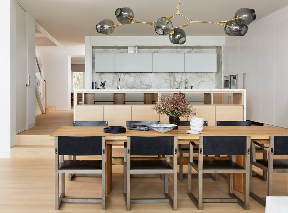Deep-seated sofas are topped with silk-velvet pillows and cashmere throws. A parchment leather cabinet houses the family's antique china collection, and a handblown glass chandelier floats above a dining table made for big family dinners - proof that contemporary architecture can feel warm and inviting, without sacrificing an ounce of style.